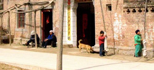 時近中午,村子里很安靜。路邊的院墻下,幾位老太坐在小板凳上曬太陽,小孩子依偎在她們身旁。