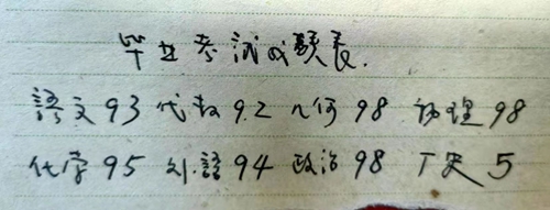 前些年,偶然在一本舊書里翻出一張紙條,是我高三畢業(yè)時的成績,它記錄著:語文:93;代數(shù):92;幾何:98;物理:98;化學:95;外語:94;政治:98。歷史實行的5計分制,得分為5。