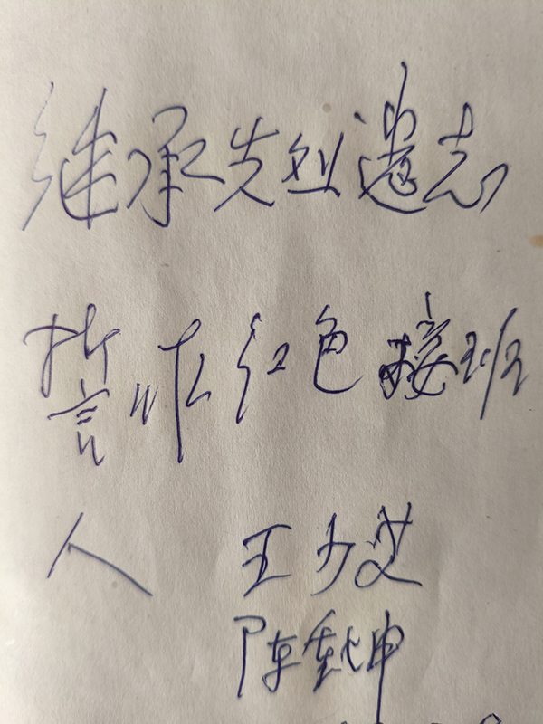 采訪過后王少艾老人揮筆為小記者團題寫了“繼承先輩遺志,誓做紅色接班人!”署名為王少艾、陳重坤。當小記者們向王爺爺提出很想看望陳毅元帥胞妹陳重坤奶奶時,王老有些為難地說:“陳奶奶中風偏癱,不能起床,天氣熱身上有異味,不太方便見大家。”大家知道陳奶奶患病在床,更想去看看老人家。晚飯過后,記者團選派了六位代表,購買了一束鮮花登門看望陳奶奶。