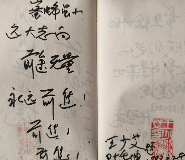 陳毅元帥誕辰100周年,新四軍研究會以上海外灘陳毅雕像為背景,印制了陳毅誕辰一百周年紀念卡,陳毅元帥的長子陳昊蘇把紀念卡題詞簽字后,郵寄給了他的姑父王老。老人家收到紀念卡首先想到的是小海燕記者團,他又在賀卡上簽字郵寄給了徐州小海燕記者團。當徐州小海燕記者團在北京采訪陳昊蘇時,陳昊蘇不知道我們記者團有這張賀卡,就又用同樣的賀卡簽名,贈送給每一位小記者。陳昊蘇說給小海燕記者團一張留存時,老師說:“已有了。”陳昊蘇問哪來的,我們說:“是你姑父王老寄的。”陳昊蘇面帶微笑說:“我姑父這個人對孩子就這么認真,他時刻想到的是孩子。”