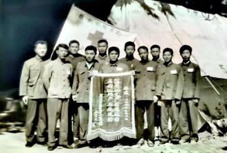 ▲一九七六年,徐州鐵路醫(yī)院楊俊卿同志率領(lǐng)赴唐山醫(yī)療隊抗震救災(zāi)載譽勝利歸來。醫(yī)療隊全體隊員在我院地震棚前合影留念。