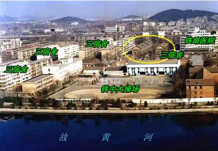▲上世紀九十年代,大郭莊機場飛行員駕直升機飛越鐵中校園時拍下了這張俯視圖,周邊三宿舍的平房都變成了六七層的樓房。當時三宿舍上沿五十年代修建的四棟青磚宿舍樓還沒有拆除(黃圈處)。右上角的白色大樓是鐵路醫(yī)院。