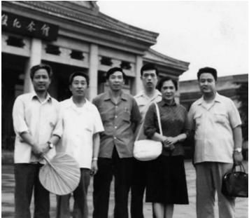 ▲鐵路醫(yī)院幾位同志與著名電影演員秦怡在淮海戰(zhàn)役紀念館前合影留念。右起:唐春恩、秦怡、秦怡隨行人員、李悅明、張普濟、“鐵道游擊隊員小坡”。