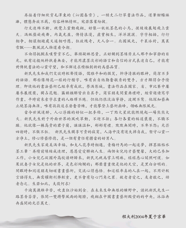 自幼酷愛書畫藝術(shù),師承著名書畫家徐靜漁、高石農(nóng)、董伯等諸名家的指教。在傳統(tǒng)基礎(chǔ)上刻意創(chuàng)新,作品融顏、米、右軍,章草于一爐,簡(jiǎn)練內(nèi)收、用筆遒勁,厚重而有拙趣,卓然不群,自成面貌。1980年起書畫作品曾多次參加國(guó)內(nèi)外大型展覽并多次獲獎(jiǎng)。藝術(shù)名錄和作品載入《中國(guó)書法家選集》《中國(guó)當(dāng)代藝術(shù)家檔案》《紀(jì)念毛澤東誕辰110周年大型書畫集》《首屆翰墨養(yǎng)生全國(guó)書畫名家邀請(qǐng)展》《首屆中國(guó)書畫小作品大賽作品集》《夢(mèng)圓世界杯中國(guó)書畫名家精品展作品集》《首屆人民書畫藝術(shù)展作品集》《中國(guó)當(dāng)代書畫名人墨跡大觀》《世界和平獎(jiǎng)獲獎(jiǎng)作品集》《新世紀(jì)中國(guó)書畫名家精品寶典》《當(dāng)代中國(guó)書畫名家精品大典》等二十多部大辭典。 |