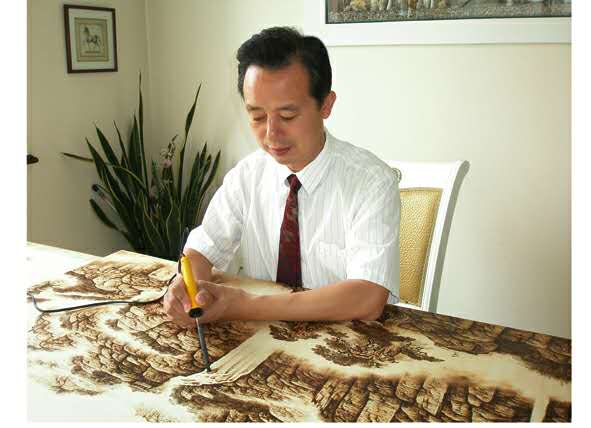 1958年,田玉田出生在江蘇徐州,大專學(xué)歷,自幼喜愛書畫,七十年代,拜原徐州國畫院院長喬俊聲老師、門下,潛心學(xué)習(xí)中國書畫。1979年考入徐州延安國畫院,專職山水畫師, 書畫藝術(shù)上形成了自己的風(fēng)格。其間曾自修于中國書畫函授大學(xué),現(xiàn)已加入中國民間協(xié)會,民間藝人及火烙畫藝術(shù)家。 近年來,中國火烙畫藝人田玉田致力于發(fā)揚火烙畫藝術(shù),潛心研究,使這種藝術(shù)發(fā)揚廣大.二零零一年入室“現(xiàn)代烙畫”創(chuàng)始人郝友友先生門下,常被郝先生贊譽(yù)道:其治學(xué)嚴(yán)謹(jǐn)、技法極端,注重層次與質(zhì)感的表現(xiàn),田玉田曾游太行山,華山,黃山,泰山山脈數(shù)次,三游江南……,師法自然,參考其它畫種苦心探索研創(chuàng)現(xiàn)代火烙畫新技法,并使其成熟,獨創(chuàng)技法代表: 風(fēng)格追求:寧靜、優(yōu)美、超逸,被畫界同仁稱為是能夠“平中見美的現(xiàn)代火烙畫天才”。先后在北京、南京、等城市參展,作品多次入選全國、省、市民間藝術(shù)展。田玉田原本是徐州延安國畫院的一位畫家,在我國傳統(tǒng)的國畫藝術(shù)方面有著很深的造詣,田玉田的現(xiàn)代火烙畫作品,給人整體上的感覺首先是細(xì)膩,現(xiàn)代火烙畫的成色比較豐富,構(gòu)圖比較飽滿, 走近田玉田,給人的感覺是執(zhí)著。是他對火烙畫工藝、精品力作的執(zhí)著追求。從事火烙畫藝術(shù)研究和創(chuàng)作20多年,困難面前不低頭,成績面前不自滿。深居簡出,為了發(fā)揚現(xiàn)代火烙畫藝術(shù),一向酷愛火烙畫藝術(shù)的田玉田,對火烙畫進(jìn)行了大膽的創(chuàng)新,經(jīng)過數(shù)年的潛心研究,針對傳統(tǒng)烙畫色彩,線條單一等不足,經(jīng)反復(fù)實踐,在木質(zhì)三合板材料上,將層疊著色與反復(fù)烙燙相結(jié)合,獨創(chuàng)出了將重彩入木三分的工藝彩烙套色現(xiàn)代火烙畫技法,這種既有油畫的立體質(zhì)感又有中國畫筆墨韻味的彩烙套色現(xiàn)代火烙畫藝術(shù),在傳統(tǒng)烙畫的基礎(chǔ)上吸收和借鑒油畫與國畫的長處,經(jīng)過燙烙、烤彩和特殊處理,不僅保留了火烙畫的浮雕效果,而且完美的再現(xiàn)了繪畫藝術(shù)的勾、描、皺、擦、點、線、渲、染等各種筆意;蚝喌溲,或重墨濃彩,山川云海靈動,毛發(fā)毫纖畢現(xiàn),畫面生動逼真,動物栩栩如生,不僅立體感增強(qiáng),色澤鮮艷,而且永不褪色,每件作品都有極高的欣賞和收藏價值。成為中國民間工藝火烙畫一絕。田玉田一心一意潛心火烙畫創(chuàng)作,《黃山煙云》、《龍馬》、《江山云海圖》、《猴戲圖》、《溪山小景》動物烙畫系列 , 等等一件件精品力作相繼聞世 ,20多幅作品被日本,新加坡,加拿大,臺灣,香港等國家和地區(qū)收藏家收藏。陸續(xù)在各類報刊雜志, <中央電視臺>、<江蘇電視臺>、〈徐州電視臺〉等多家新聞媒體曾做過多次專題報道。1998年8月上旬,田玉田創(chuàng)作的木板現(xiàn)代火烙畫《黃山煙云》獲得“中國國際首屆民間藝術(shù)博覽會大獎賽金獎。2007年6月田玉田創(chuàng)作的木板現(xiàn)代火烙畫(農(nóng)家馬)榮獲第五屆中國民間山花獎,民間工藝獎,金獎。作為一名中國的民間現(xiàn)代火烙畫藝人田玉田大的愿望就是希望能通過自己的火烙畫把中國本土的民間藝術(shù)現(xiàn)代火烙畫文化表現(xiàn)出來。使現(xiàn)代火烙畫這一民族藝術(shù)瑰寶,發(fā)揚光大。 |