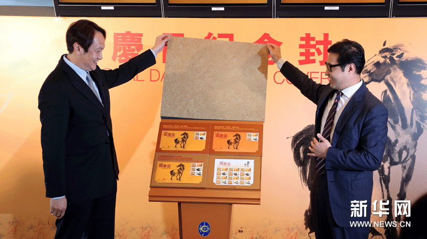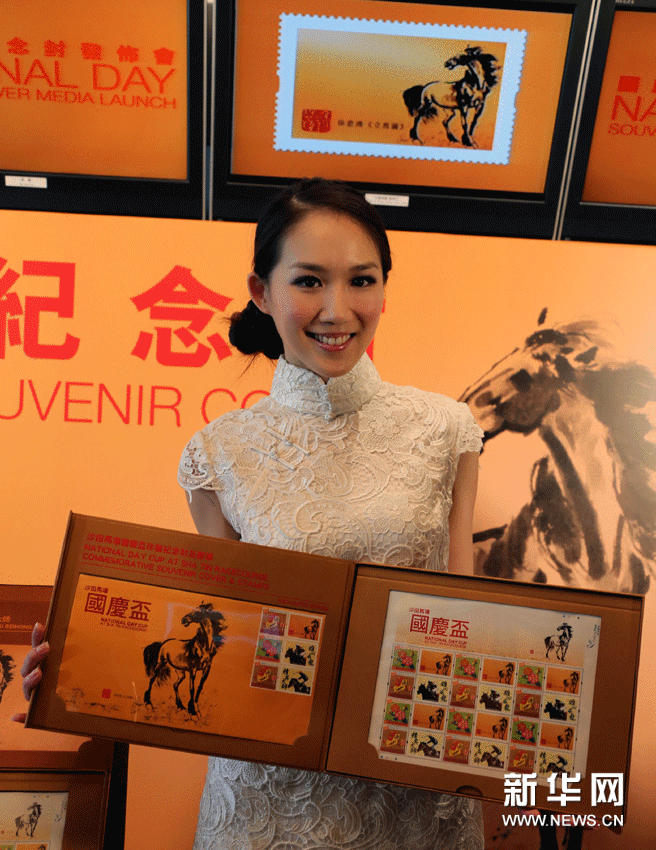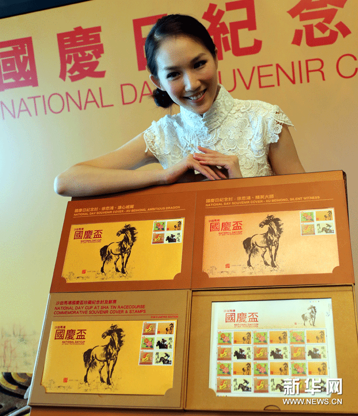 當日,為慶祝“十一”國慶節(jié),香港賽馬會與香港郵政合作推出以徐悲鴻名作《立馬圖》及兩匹香港馬王為主題設計的國慶日紀念封。紀念封將于10月1日向公眾公開發(fā)行。新華網圖片 李鵬 攝