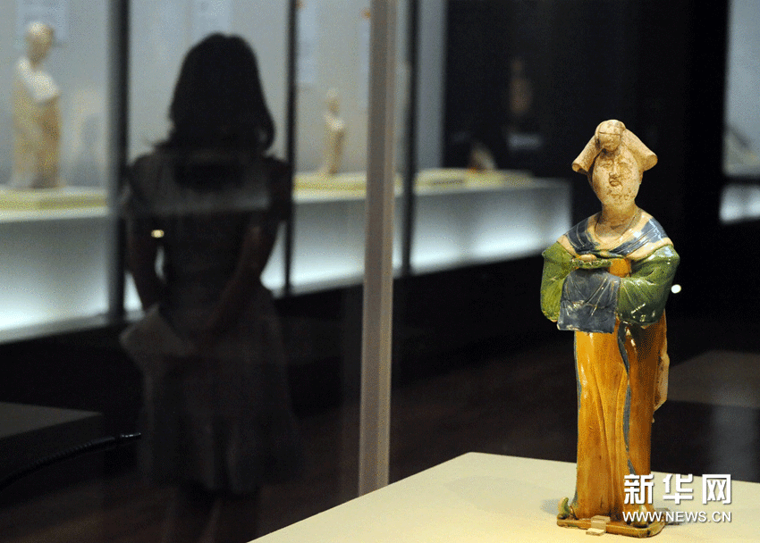 (3)10月9日,在日本東京國立博物館舉行的《中國王朝至寶展》媒體預(yù)展上,觀眾觀看唐三彩侍女像。