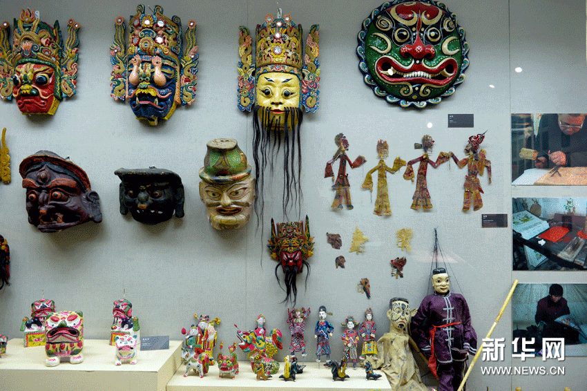 (3)山東工藝美術(shù)學(xué)院民藝博物館里展示的木偶及儺戲面具(11月7日攝)。