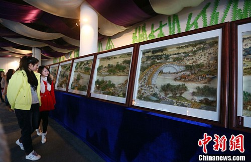 11月22日,觀眾被展出的紙雕《清明上河圖》吸引。當(dāng)天,一幅紙雕作品《清明上河圖》落戶南京棲霞紫東國(guó)際創(chuàng)意產(chǎn)業(yè)園,并將于27日舉行的青奧國(guó)際紙文化藝術(shù)展上和民眾見面。中新社發(fā) 泱波 攝