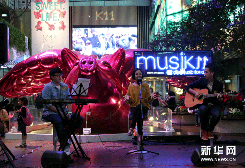 (2)12月1日,幾名年輕藝人在香港K11為顧客表演。