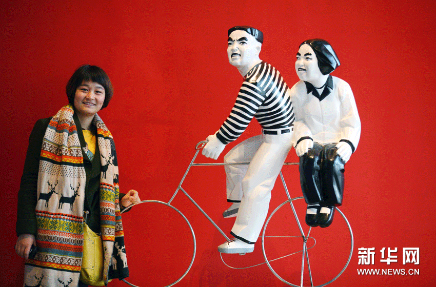 (4)12月8日,參觀者在南京藝術學院百年校慶師生美術作品展上與一件雕塑作品合影。