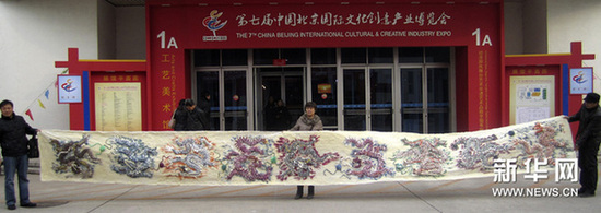 新華網(wǎng)北京12月20日電 當日,第七屆中國北京國際文化創(chuàng)意產(chǎn)業(yè)博覽會展覽會在北京中國國際展覽中心(老館)開展。內(nèi)蒙古赤峰市民陳繼英創(chuàng)作的絲綿彩畫《九龍壁》亮相文博會。這幅絲綿彩畫長8.8米,寬0.9米,耗費10余種顏色的絲綿共約2公斤,畫面上的9條龍有很強的立體感。