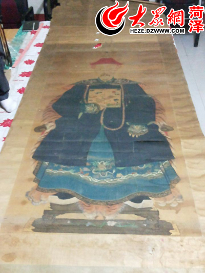 “說(shuō)到何家古老的東西,我還存著一件更久遠(yuǎn)的畫(huà)像。”何淑泰老人一邊說(shuō),一邊打開(kāi)一個(gè)破舊的木桶,一幅長(zhǎng)3米、寬1.1米的破舊畫(huà)像展現(xiàn)在眼前。