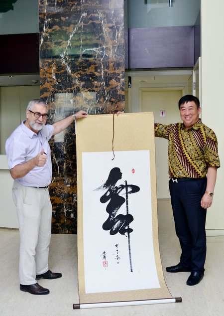 在俄羅斯聯(lián)邦駐華大使館文化中心,李樂林先生一行受到了郭登納先生的熱情接待,郭登納先生十分熱愛中國,尤其喜歡中國古老的東方藝術(shù),他是著名的中文博士,中文表達(dá)比較流利,對中國傳統(tǒng)文化研究涉獵較廣;他對李樂林先生創(chuàng)作的象形書法“舞”特別贊賞,愛不釋手,他和李樂林在交談中表示,一定把這幅象征俄中友誼的書畫作品帶回俄羅斯,掛在自己的家中。臨別時(shí),他還寫下了他在俄羅斯的聯(lián)系方式送給李樂先生。