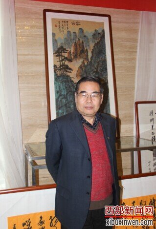 陜西省新聞書畫家協(xié)會副主席李榮在畫展 其身后就是他的山水畫《江山》