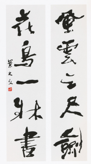 大文先生身邊時(shí)刻帶著一個(gè)小本本,見到好的聯(lián)語隨時(shí)記錄,有空閑就找出來審閱、臨摹。積土為山,積流為川。在藝術(shù)創(chuàng)作上,他一直堅(jiān)持于不懈地積累,不停地探索,不斷地揣摩,日漸精進(jìn),步入老境,不求怪誕,不求矜巧,以寫心抒情為第一旨要。他的代表作“風(fēng)云三尺劍,花鳥一床書”楹聯(lián),在1989年《書法》雜志第五期發(fā)表后,香港《大公報(bào)》作專題介紹,又被《當(dāng)代藝術(shù)家楹聯(lián)辭典》列其卷首,《書法》雜志主編周志高先生評(píng)曰:“上下氣勢連貫,一氣呵成,字字各有姿態(tài),頗為生動(dòng)。”書法評(píng)論家崔陟評(píng)曰:“用筆古拙,若松柏勁拔,結(jié)體欹正相生,風(fēng)格獨(dú)具,令人拭目。”他的榜書《臥石觀云》《清華園》《大風(fēng)歌》等等,氣勢雄強(qiáng),先聲奪人,汲碑版之險(xiǎn)絕,參漢簡之意趣,蘊(yùn)北碑而除粗野,著南帖而去柔媚,將漢之峻峭、魏之風(fēng)度、明清之情趣融于其中,力求自由瀟散之風(fēng)韻,寄妙理于意趣之中,端莊中見靈動(dòng),輕盈里有凝重,生澀間融閑適。他的一字書“鷹”字,給人以意象,給人以美感,是難得的佳作。一字之得,積思數(shù)年;妙趣天成。