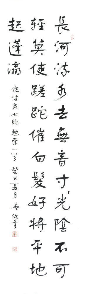 直到現(xiàn)在,金德欣仍從事著書法教學(xué)事業(yè)。幾十年的執(zhí)教生涯,使他熟知中國書法史及各體書法技法,對書法美學(xué)和與書法相關(guān)的文字學(xué)也是了然于心。他深知學(xué)習(xí)書法亦足以恢?jǐn)U才情、醞釀學(xué)問,故讀書寫字從未間斷,他作書有一種汩汩其來之勢,透露出較高的文化涵養(yǎng)和藝術(shù)品格。