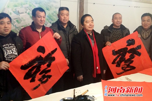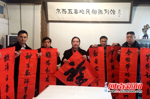 “花果飄香美哉樂(lè)土,猴年增色豈換人間;勤羊辭舊千家同喜,頑猴鬧春萬(wàn)戶皆福。”1月16日上午,距春節(jié)還有20余天,北京五里坨民俗陳列館內(nèi),卻是一派喜氣洋洋的節(jié)日氛圍。一副副火紅的春聯(lián),散發(fā)出濃濃的喜慶年味兒。在此,劉迅甫將近期完成的千副春聯(lián)送到了農(nóng)民工代表手中。同時(shí),劉迅甫濃墨開(kāi)寫(xiě),為來(lái)此的市民、游客送“福”、送作品。