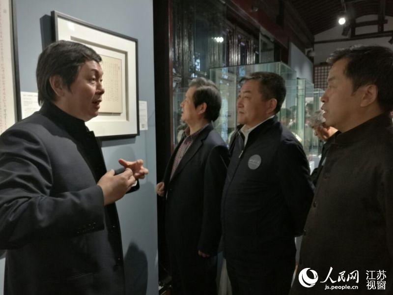 內(nèi)容摘要: 曹志明(左一)向來賓介紹作品! ∪嗣窬W(wǎng)蘇州4月11日電 (施憶)2016年4月10日,山水鄉(xiāng)愁——曹志明《國學(xué)經(jīng)典·書藝展》在蘇州博物館開幕。此次主題展
