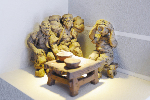 這第一大“法寶”就是“接地氣”。走進(jìn)王光永的工作室,你會(huì)立刻被櫥窗里的作品吸引去了目光:咧嘴憨笑的山里娃、扭秧歌的老婆婆、賣冰糖葫蘆的老大爺、大口喝著大碗茶的孩童……看著這些古拙的、憨厚的“鄉(xiāng)里鄉(xiāng)親”,讓人不由自主地會(huì)有種親切感……
