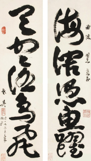 作為一種富有特質(zhì)的美術(shù)作品,漢畫像石中暗含解讀徐州藝術(shù)歷史與今天的密碼。張伯英是徐州文化人中第一個(gè)搜求漢畫像石的人,段谷風(fēng)、朱振庚則是主動從漢畫像石的構(gòu)圖、走線獲取靈感的藝術(shù)家。觀賞二位先生的畫作,可以隱約感知徐州漢畫像石的簡約之美、變形之奇。雖然,如今藝術(shù)的材質(zhì)變了,形制變了,但美術(shù)的精神則古今貫通。