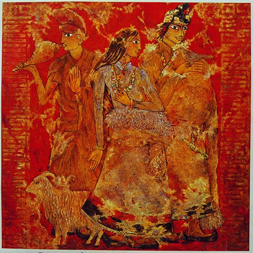 數(shù)度藏區(qū)之旅、涼山之行和穿越天山南北,讓他在上世紀(jì)八九十年代畫出了成名作“吉祥雪域”系列。其系列多達(dá)30余幅,這些畫作并不像當(dāng)時流行的描繪雪域藏民生活情景的寫實(shí)油畫,而是將藏女日常生活中的祈禱、轉(zhuǎn)經(jīng)、負(fù)水、放牧等形象提煉為畫面的主體,并通過與被符號化了的寺院、圣像、圖騰、瑪尼堆經(jīng)文的組合,來諭指那些辛勞而歡愉、肅穆而神圣的雪域生活。