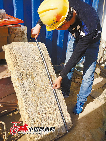 記者聯(lián)系徐州博物館考古專家后來到現(xiàn)場,蔡先生說的石板就立著靠在工地一處板房外。經(jīng)測量,這塊石板厚度約8厘米,高1.02米、寬48厘米。石板兩面都經(jīng)過簡單雕琢打平,均勻分布著鏨花。石板其中一面的上、下、左三個方向刻有陰線框,方框內(nèi)陰刻有圖案,個別圖案位置的雕刻有侵蝕剝落。蔡先生介紹說,這塊石板是他半個月前發(fā)現(xiàn)的,當時它被在地下施工的挖掘機挖土翻倒地面上,埋在雜土里只露出一個角。他看石板比較平整就好奇地走近看看,用手撥開上面附著的泥土,露出了石板上的雕刻痕跡,看上去比較古老,就好奇地把石板搬到了板房邊靠墻立著,又用水沖刷了一遍,看看上面究竟雕刻了什么。他認為,石板上的圖案,看上去像一個奇怪的人形。