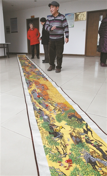 為了創(chuàng)作,周中原做了充分的準備和研究。“要想剪好,必須得畫出這幅作品。”他扎實的繪畫功底這時凸顯作用了。在之后的三年里,1000多個夜晚,他先后經(jīng)過繪畫、上底色、摳刻、鑲金邊……等6道工序,終于完成了這幅長16.3米,寬0.6米的《清明上河圖》,完整再現(xiàn)了北宋商貿(mào)的盛景。