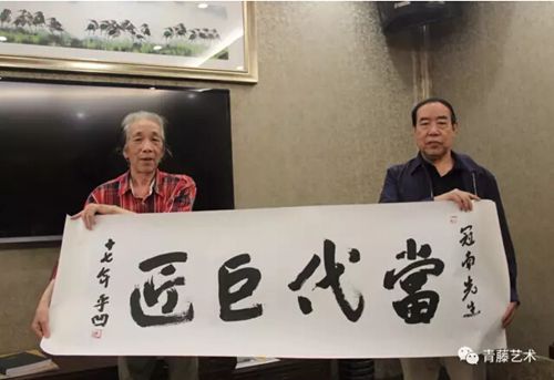 如此,他對書畫自有一番品位,相交者也多有書畫人。而當(dāng)他細讀吳冠南先生作品時,以為震撼,爽利寫下“當(dāng)代巨匠”四個字,定要當(dāng)面交付吳冠南先生。
