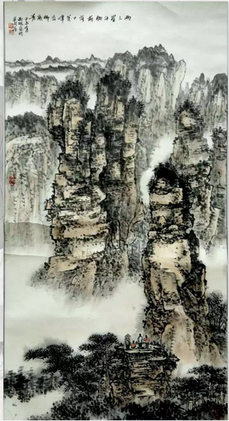 畫家張錫杰說過:“一個(gè)畫家必須站在宏觀的高度看世界,要有宇宙觀的意識,方能畫出大氣、超凡的佳作來。畫得生機(jī)、豐盛、完滿、節(jié)奏、韻律、神氣,是為大美! ”欣賞謝鵬的山水畫,我們可以看到他正在向這條道路不斷探索前行。大山之雄偉,松石之奇俏,云海之洶涌浩瀚......滿紙充溢著一種撲面而來的雅逸之氣,靈性與活力讓山水不死。畫中灌注的,除了大自然的生氣,還有山水畫家自己的生命力。