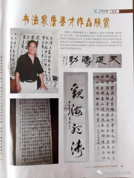 唐善才,晉陽(yáng)堂后人,醉墨軒主,網(wǎng)名萬(wàn)歲枯藤。江蘇省書(shū)法家協(xié)會(huì)會(huì)員,中國(guó)書(shū)畫(huà)家協(xié)會(huì)會(huì)員,中國(guó)老年書(shū)畫(huà)研究會(huì)會(huì)員,江蘇省老年書(shū)畫(huà)研究會(huì)會(huì)員,徐州市書(shū)法家協(xié)會(huì)會(huì)員,徐州詩(shī)詞協(xié)會(huì)會(huì)員,徐州市文化藝術(shù)交流協(xié)會(huì)會(huì)員,《書(shū)法報(bào)》徐州工作站慧衡書(shū)院副院長(zhǎng)。