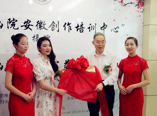 中國書畫院藝術(shù)總監(jiān)張冰先生介紹中國中國書畫院概況;中國書畫院副秘書長、中國書畫院安徽分院行政院長、中國書畫院安徽創(chuàng)作培訓(xùn)中心負責(zé)人王衛(wèi)民先生、安徽省書協(xié)副主席、安徽省書畫創(chuàng)作研究院院長陳建國先生、安徽省工商聯(lián)企業(yè)家及藝術(shù)家聯(lián)合會秘書長江華先生、安徽省文史館館員、省美協(xié)顧問、中國書畫院安徽分院院長朱秀坤先生先后致辭;安徽省軍區(qū)原司令員沈善文將軍和中國書畫院常務(wù)秘書長許可女士為“中國書畫院安徽創(chuàng)作培訓(xùn)中心”揭牌。