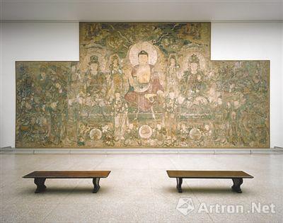 除傳統(tǒng)書畫外,入藏該館的中華文物還有諸多巨制,位于博物館二樓東方部的中國(guó)山西省洪洞縣廣勝寺的元代巨型佛教壁畫《藥師經(jīng)變》(見上圖,張?jiān)鹿﹫D)就是經(jīng)典。作品整體寬15.2米、高7.52米,氣勢(shì)磅礴。畫中端坐著藥師佛,十二神將陪伴左右。作品構(gòu)圖疏密相間,場(chǎng)面恢弘,色彩繁復(fù),線描精巧,形象地表現(xiàn)了藥師如來及其隨從所在的東方佛教凈土的盛況。這幅從廣勝寺佛殿中剝離的巨型壁畫,經(jīng)歷曲折。該畫雖經(jīng)歷了700多年的滄桑輾轉(zhuǎn)而瑰麗依舊,堪稱藝術(shù)珍品,也是大都會(huì)藝術(shù)博物館最知名的中國(guó)藏品。
