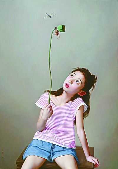 畫家超然觀察世界的目光,永遠(yuǎn)內(nèi)含古典的秩序。這種秩序其實(shí)并非源于自然,而是畫家心靈中的“絕對律令”。李貴君的《一切是否完好如初》里的那位姑娘,張開十指,想要盡力推開眼前那道完全透明,透明到好像并不存在的“墻”——這就是距離,它隔離了世界,只能這樣隔空對視。李貴君以古典的唯美主義超然而優(yōu)雅地進(jìn)行表達(dá),取得一種“間離”美學(xué)的效果。距離產(chǎn)生美,這美因此朦朧恍惚,使李貴君的人物畫有了某種魔幻詩性,這或許也是一種藝術(shù)的超然。浪漫的玫瑰會永不凋謝嗎?那只蜻蜓會落到少女的蓮蓬上嗎?沒有答案,恰如他畫中出現(xiàn)過的少女直視的雙眸和女孩懷中黑貓警覺的黑瞳。