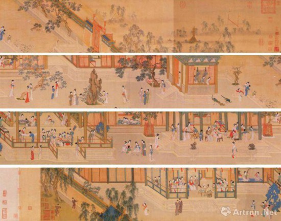 雖然仇英《漢宮春曉圖》不怎么受乾隆帝喜歡,但他對“漢宮”這一描繪亭臺樓閣及宮廷仕女的藝術(shù)題材十分上心。在乾隆的主導(dǎo)下,宮廷畫家們先后于乾隆三年(1738年) 、乾隆六年(1741年)、乾隆十三年(1748年) 、乾隆三十三年(1768年)仿制《漢宮春曉圖》 。從內(nèi)容來看,這四卷作品與仇英版大不相同,它們更傾向于將仕女置于一個被建筑包圍的環(huán)境中,使得整卷畫看起來更像是建筑畫而非人物畫。對濃重色彩的偏愛也讓宮廷園囿看起來更金碧斑斕。這當(dāng)然與西洋畫法的引入及乾隆的個人喜好有關(guān)。
