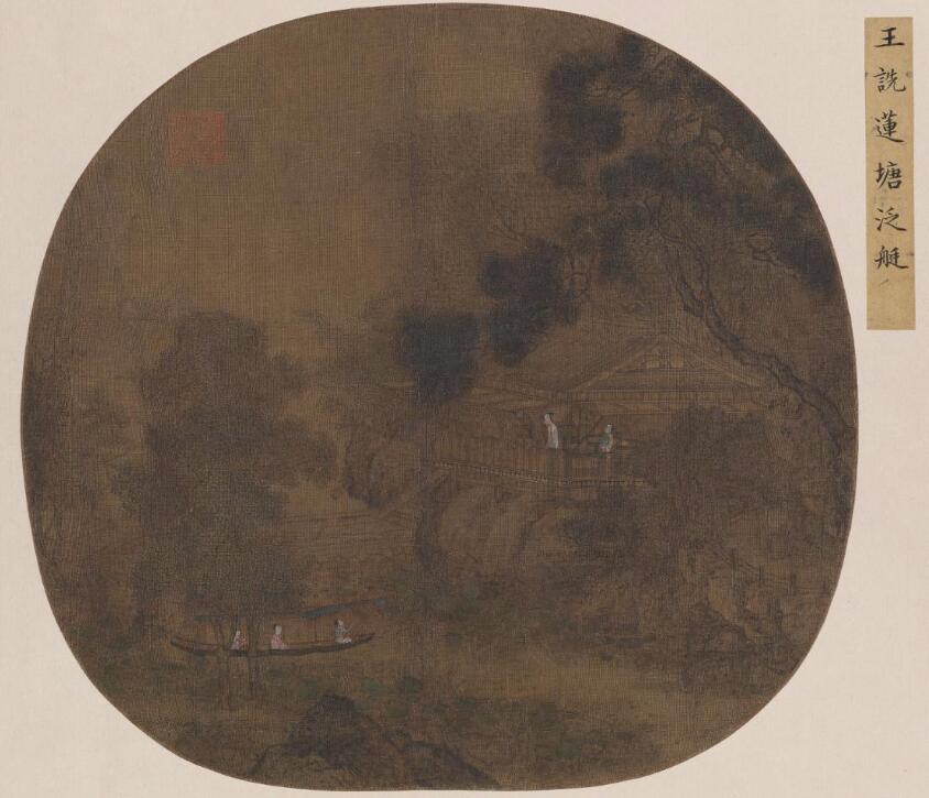 畫面長(zhǎng)松密林,坡陀水閣。水閣內(nèi)二女子,一執(zhí)扇閑坐,一憑欄眺望,坡下蓮塘,一女泛舟而來(lái)。圖頁(yè)中的水閣以細(xì)筆勾勒,刻畫精微,設(shè)色淡雅,雖大不盈尺卻美侖美奐。此圖高度寫實(shí)的繪畫風(fēng)格繼承了北宋畫院的傳統(tǒng),而蓮塘的迷濛與空靈增添了畫面亦真亦幻的抒情效果。