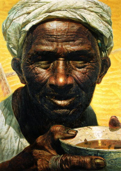 《父親》描繪的是一位在烈日下端著瓷碗準備喝水的農(nóng)民形象。作者采用照相寫實的油畫技法,在216×152厘米的畫布上盡可能地表現(xiàn)了他所了解的農(nóng)民的全部特質(zhì),并通過放大細部的方法增強藝術(shù)感染力。畫面中的農(nóng)民飽經(jīng)滄桑,黝黑而粗糙的面龐上布滿了歲月的痕跡。眉弓上的汗珠、干裂的嘴唇、有著厚厚老繭的拇指、用布包裹著的手上的傷口以及帶有些許裂紋的瓷碗等,無不書寫著生活的艱辛與不易。