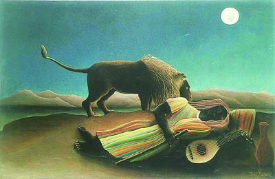 亨利·盧梭的《熟睡的吉普賽人》充滿了夢(mèng)幻色彩。漂泊的吉普賽女郎沉沉酣睡,路過的獅子平靜地立在一旁,朦朧的月色發(fā)出神秘的光芒,似乎雄獅應(yīng)她的召喚而來(lái),畫面節(jié)奏經(jīng)過精心設(shè)計(jì),輪廓準(zhǔn)確,色彩清澈,意境和諧而富有韻味。