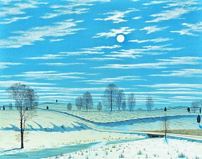 亨利·法雷爾的《月光》畫面簡(jiǎn)單,色彩純粹。月亮在白云飄浮的天空中似乎毫不起眼,淡藍(lán)的天空與白色的云彩占據(jù)畫面的大面積空間,河流、大地與樹林呈線塊狀分布,圓圓的銀色的小小的月亮卻是最吸引眼球的焦點(diǎn)。