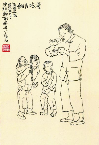 圓圓的月餅象征團圓和睦,是全民喜愛的中秋糕點。一枚小小的月餅,大江南北口味不同,但吃出的是同一份溫暖祥和。當(dāng)代畫家賀友直有一幅漫畫《中秋說月餅》,還有一篇同名散文,形象地寫出了吃“蘇式月餅”的講究:“右手大拇指、食指捏著月餅送到嘴里咬,同時左手掌心朝上作接受狀置于月餅下方,接咬時脫落下來的月餅皮屑,然后再用舌尖把月餅碎屑粘著縮進嘴里吃下。”文字配畫,惟妙惟肖,意趣躍然紙上。