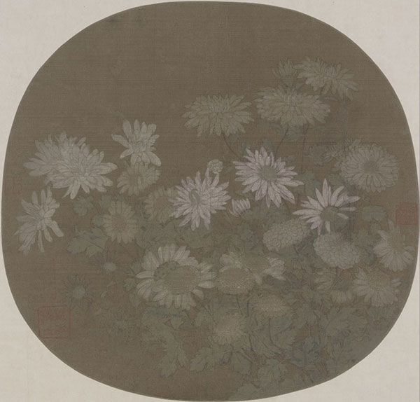 圖繪秋菊一叢,紅白相間,繁枝茂葉,生機勃發(fā),不見肅殺秋意;ò暧弥袖h細(xì)筆勾描,再以朱紅或白粉暈染;花蕊用細(xì)筆點出;茂密的葉片或用赭石、或略入汁綠、或稍加藤黃染出,以示老嫩不同的色彩。花之欲開、盛開、將殘,葉之翻卷及明暗向背,刻畫得恰到好處。畫風(fēng)工致細(xì)膩,構(gòu)圖豐滿,繁而不亂,密而不窒,設(shè)色艷而不俗,為南宋寫生畫佳作。(圖釋文字:潘深亮)