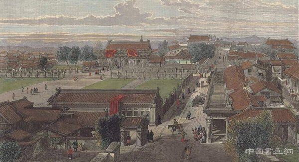 新娘進(jìn)宮,儀式搞得很磨人,一定要繞道大清門(mén),還要停在門(mén)里,由宮里的嬤嬤向她講解婚事的程序及宮中生活的規(guī)矩。然后,她要被一步步抬過(guò)千步廊,才能來(lái)到紫禁城南門(mén),就是今天的天安門(mén)。這一路可長(zhǎng)呢,正好從廣場(chǎng)紀(jì)念堂的南邊走到城樓子下邊。現(xiàn)在除了天安門(mén),其他建筑都沒(méi)有了。辛普森的創(chuàng)作為我們畫(huà)了一條聲勢(shì)浩大的娶親之路,也順便幫我們留住了天安門(mén)廣場(chǎng)140年前的樣子。