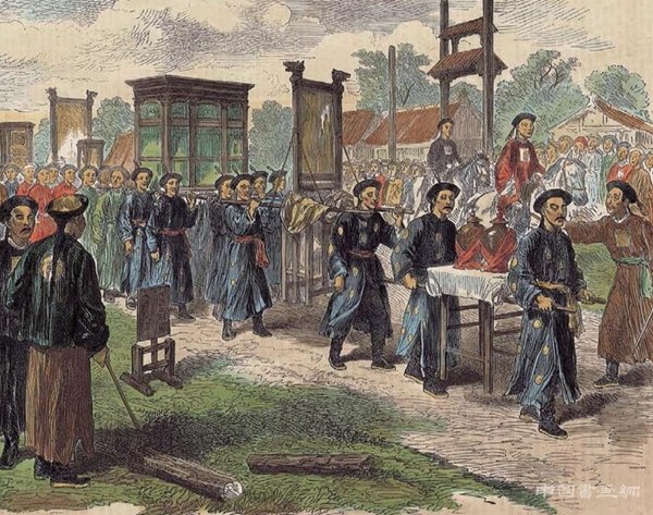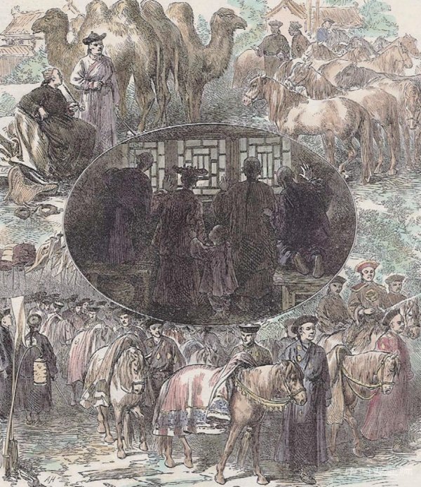 據(jù)辛普森說(shuō),一連五六天的清晨,這條路上的嫁妝儀仗隊(duì),前腳接后腳,遮天蔽日,像大螞蟻搬家一般。得感謝各省官員爭(zhēng)先恐后的進(jìn)貢,東西多得不能盡數(shù),其中一張娶親圖中還有大批的活物,能搜羅到的天下珍寶, 統(tǒng)統(tǒng)被集中到了京城。17歲的小皇帝,收獲了大把的“忠心”, 垂簾聽(tīng)政的慈禧太后也掙足了面子。