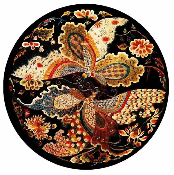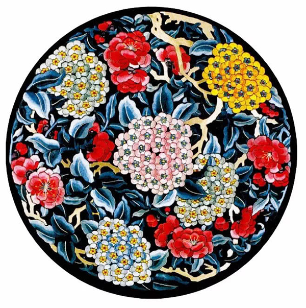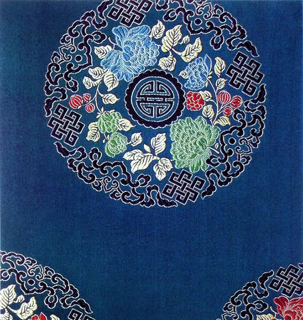 團花圖案常見于袍服的胸、背、肩等部位。有放射、旋轉(zhuǎn)、對稱式等結(jié)構(gòu)。
