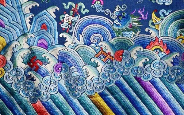波濤洶涌的水波紋有氣勢磅礴,威嚴(yán)不可觸犯之態(tài)。多用于龍袍、蟒袍、官府的袖口,下擺,常與龍紋、蟒紋、鳳紋等相配使用,是身份的象征。由水波紋與山石組合而成的“海水江崖紋”,象征江山,有一統(tǒng)江山,福山壽海,江山永固之意。