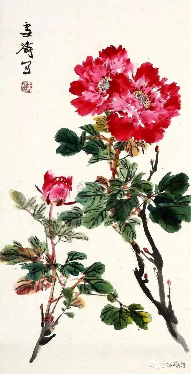 § 紅花:用朱紅、大紅、曙紅。以朱紅為主調(diào)大紅成基本色,筆尖醮曙紅點(diǎn)畫(huà)。也可以筆肚上足牡丹紅,筆尖醮胭脂畫(huà)出,色濃渾厚,要不,干了就顯得單薄。