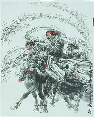 三位身著傳統(tǒng)服飾的高原漢子,策馬奔騰,豪氣干云。畫題雖為“豐慶圖”,卻并不具體描畫豐慶場面,只以簡潔硬朗的線條勾勒高原漢子的形象。這是馮遠(yuǎn)的水墨畫《高原豐慶圖》,畫家對于“人”的關(guān)注一以貫之,富于象征意義和代表性的個體形象躍然紙上。