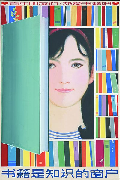 改革開放賦予了文化藝術(shù)新的時代特色,最顯著的就是宣傳畫開始擺脫以往紅、光、亮的形象。張安樸創(chuàng)作于1983年的《書籍是知識的窗戶》,就是當(dāng)年同類宣傳畫中構(gòu)思獨特的作品之一。在色彩斑斕的書籍(知識)海洋中,翻開的書本寓意知識的窗戶為知識的追尋者而打開,青春少女明眸閃亮,對新知識充滿企盼與渴望。