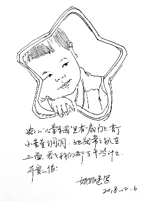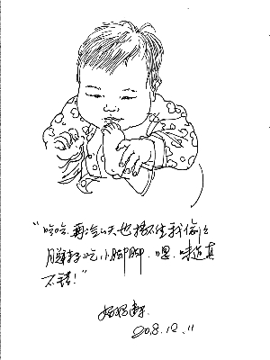 暖心畫的主人公叫典典,一名9個(gè)多月大的小女嬰。畫中的典典,胖乎乎的大腦袋,眼睛水靈靈的,特別可愛。有的畫上媽媽還配了文字,比如典典抓著氣球玩的,邊上寫著:哈哈,我抓到一只氣球,不會(huì)放手的!其中有一幅特別讓人忍俊不禁,是典典雙手捧著自己的腳往嘴里塞,邊上的文字這樣寫道:哈哈,再冷的天也捂不住我偷偷脫襪子吃小腳腳,嗯,味道真不錯(cuò)!還有一幅畫,可愛中透著一些意趣,是典典透過一個(gè)“兒童樂園”(塑料圍欄)的星星狀窗戶往外看,配的文字是:典典的“兒童樂園”里有一扇門,門上有個(gè)小星星洞洞,她就常常趴在上面,看看我們都在干些什么,可愛得很!