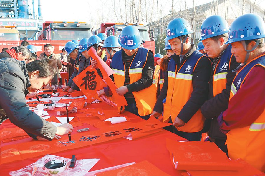 ◆ 1月22日,合肥市市政工程管理處新港基地施工現(xiàn)場(chǎng),書(shū)法家為農(nóng)民工書(shū)寫(xiě)春聯(lián)。當(dāng)日,省圖書(shū)館聯(lián)合合肥市市政工程管理處開(kāi)展“文化走基層”活動(dòng)。記者 許昊 通訊員 殷俊 攝